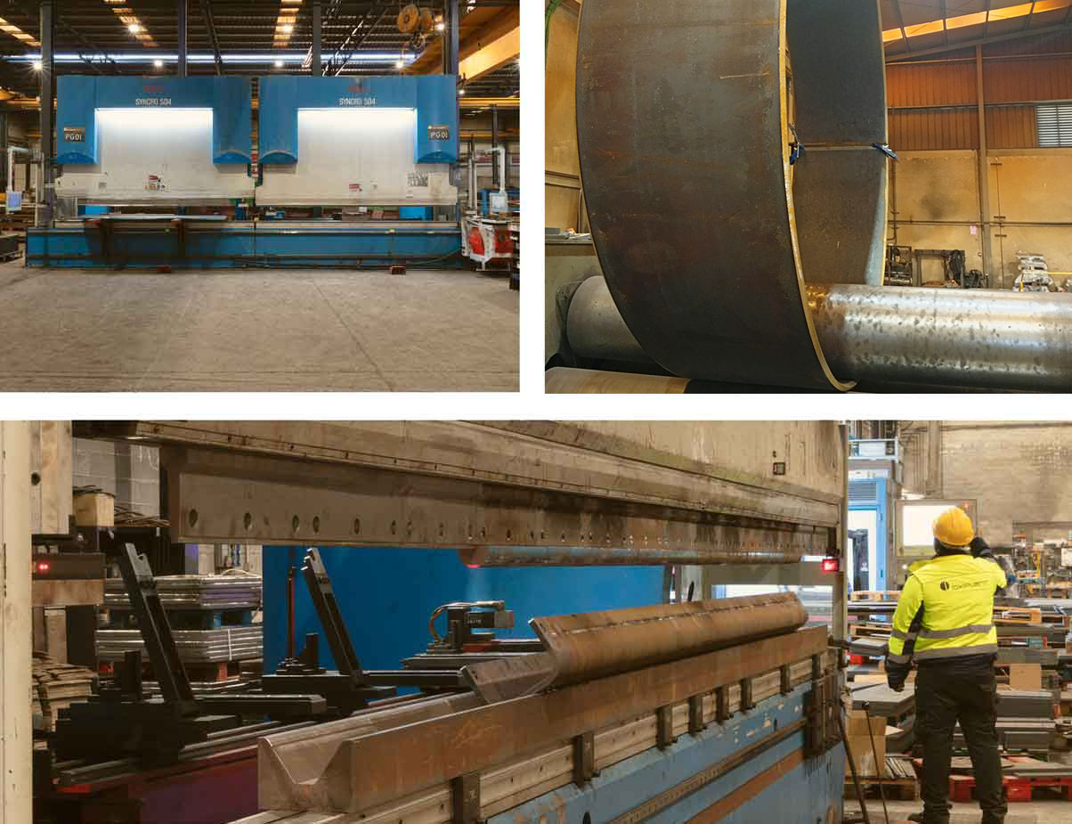 Para el curvado, contamos con 3 curvadoras de rodillos capaces de trabajar espesores de hasta 45 mm y piezas de hasta 2 t, cubriendo un amplio rango de necesidades en radios y dimensiones.